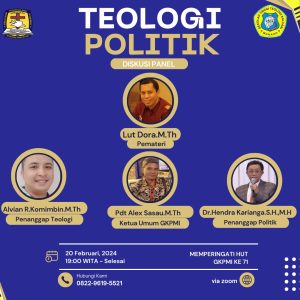 Webinar ini menampilkan Lut Dora, M.Th sebagai pemateri utama, dengan Alvian R Komimbin, M.Th sebagai penanggap dalam aspek teologi, dan Dr. Hendra Karianga, S.H., M.H., memberikan pandangan dalam konteks politik. Ketiganya memberikan perspektif mendalam tentang bagaimana teologi dan politik saling mempengaruhi dalam kehidupan masyarakat.